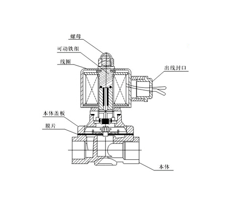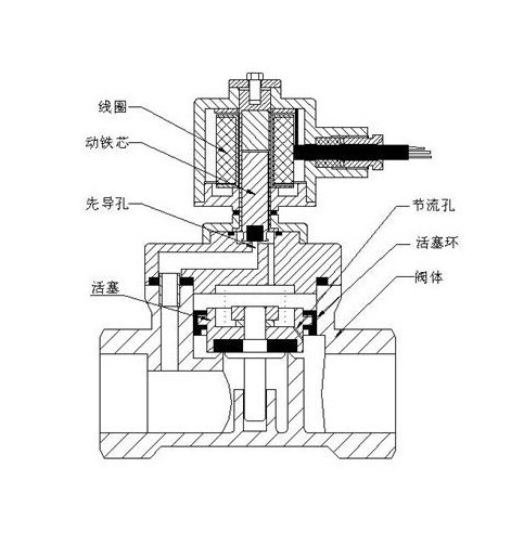 線圈通電后由于吸力作用,動鐵芯下移,把副閥閥塞壓下,副閥關(guān)閉,主閥閥杯內(nèi)壓力上升,當(dāng)壓力升到一定值時,主閥閥杯的上下壓差一樣,由于電磁力作用,動鐵芯失去主閥閥杯下,壓緊主閥閥座,閥門關(guān)閉。線圈斷電時,電磁吸力為零,副閥閥塞和支鐵芯由于彈簧作用向上提起,副閥打開,主閥閥杯上的流體經(jīng)副閥流走,減少了作用在主閥閥杯上的壓力,當(dāng)主閥閥杯上的壓力減少到一定值時,利用壓差把主閥閥杯推起,主閥打開,介質(zhì)流通。